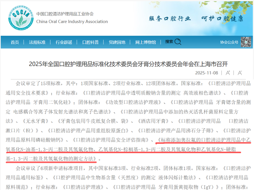 近日,在2025年全国口腔护理用品标准化技术委员会牙膏分技术委员会年会上,一项聚焦于牙膏中“奥拉氟”精准检测的团体标准完成审定,进入落地倒计时。这项标准由国内儿童口腔护理品牌兔头妈妈牵头,联合浙江省质量检测科学研究院等单位共同推进,旨在破解行业长期以来的检测难题,为产品质量划定清晰底线,推动产业向“有效添加、精准管控”的高质量阶段升级。